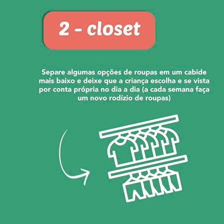 Dica 2 – Closet: Separe algumas opções de roupas em um cabide mais baixo e deixe que a criança escolha e se vista por conta própria no dia a dia (a cada semana faça um novo rodízio de roupas).