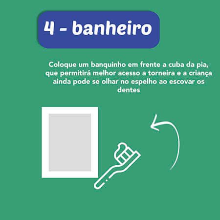 Dica 4 – Banheiro: Coloque um banquinho em frente a cuba da pia, que permitirá melhor acesso a torneira e a criança ainda poderá se olhar no espelho ao escovar os dentes.