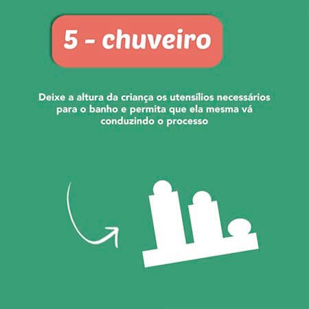 Dica 5 – Chuveiro: Deixe a altura da criança os utensílios necessários para o banho e permita que ela mesma vá conduzindo o processo.