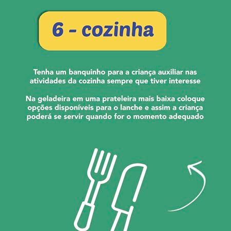 Dica 6 – Cozinha: Tenha um banquinho para a criança auxiliar nas atividades da cozinha sempre que tiver interesse. Na geladeira, em uma prateleira mais baixa, coloque opções disponíveis para o lanche e assim a criança poderá se servir quando for o momento adequado.