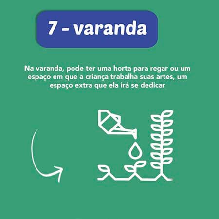 Dica 7 – Varanda: Aqui pode ter uma horta para regar ou um espaço em que a criança trabalha as suas artes, um espaço extra em que ela se sinta a vontade para se dedicar nestas atividades.