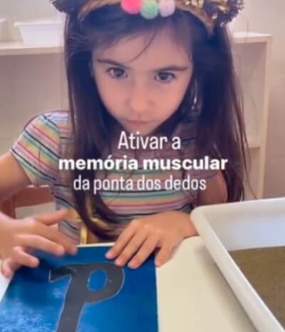Explorando as letras de lixa, a criança ativada a memória muscular da ponta dos dedos e aprende sensorialmente o traçado de cada uma. Posteriormente reforça essa habilidade na caixa de areia para treinar memorizar o grafema.