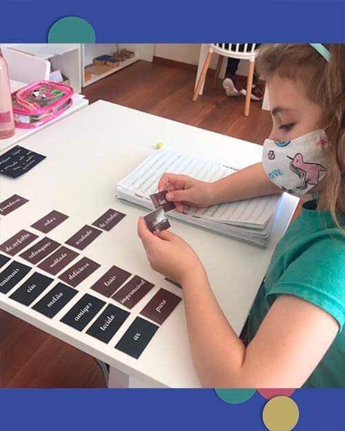 Como vemos nas imagens, a criança escolhe seu cartão, organiza as frases de acordo com as regras que determinam o uso correto da língua escrita e falada e, em seguida, realizam atividades gráficas em seu caderno.⠀