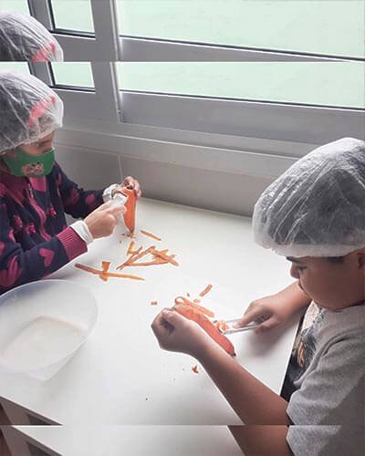 A concentração reina na hora de descascar, cortar, preparar. Um processo cheio de autonomia e vida prática que as crianças adoram participar.⠀